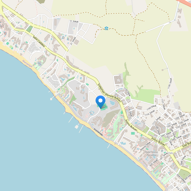 Отель расположен в 3км от центра города Side, и 6км от города Manavgat. Анталийский аэропорт находится в 65 км от отеля. Отель расположен на 1 береговой линии, имеет собственный песчаный пляж с мягким песчаным пологим входом в море.