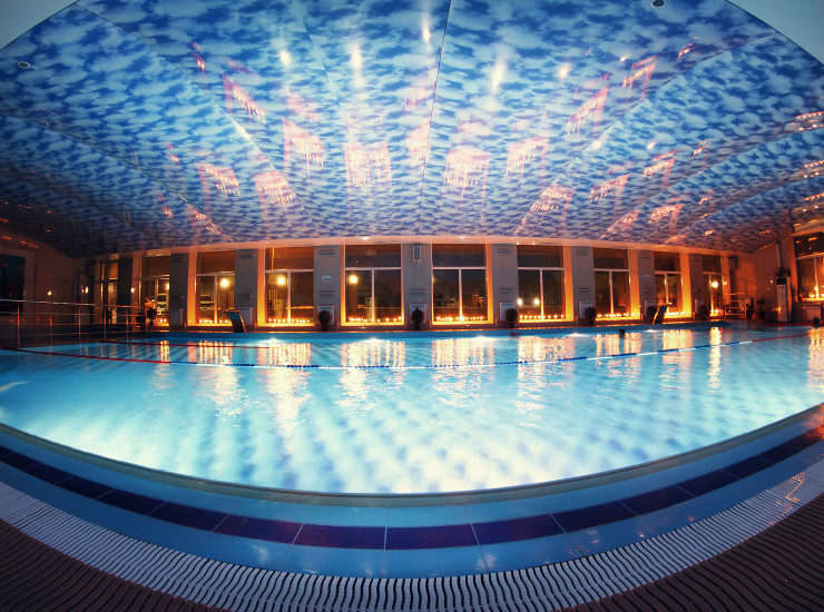 Бассейн длиной 20 м шириной 8,5, глубиной от 1,3 м до 1,5 м. Оснащен фонтанами, гейзером, подводной подсветкой, гидромассажем.