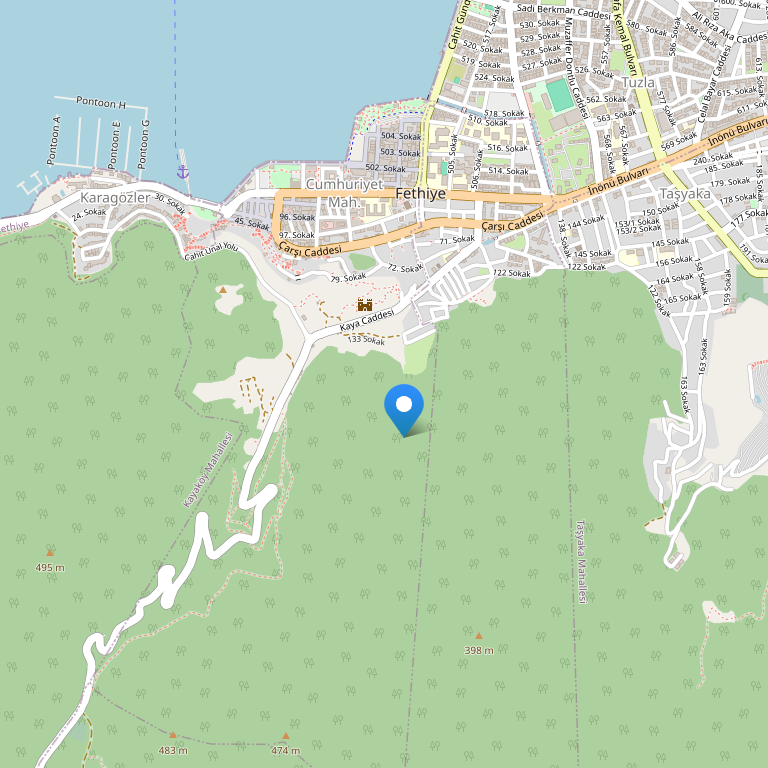 Отель располагается на просторной территории площадью 9000 кв.м в поселке Овачик, в предместье курорта Бабадаг, в тихом месте, всего в 400 м от главной дороги, в окружении гор и зелени, в 10 минутах езды (4 км) от знаменитого пляжа Олюдениз в Голубой лагуне и на таком же расстоянии от пляжа Калис в Фетхие. До поселка Хисарону, где вы найдете множество ресторанов, дискотеки, ночные клубы и магазины, - всего 5 минут ходьбы.