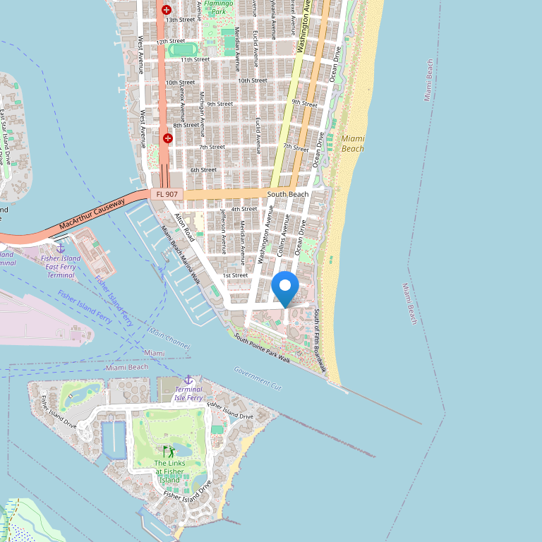 Отель находится на берегу Атлантического океана, на знаменитом перекрестке Майами Бич Ocean Drive и Пятой улице в Miami Beach, штата Флорида – в самом центре South Beach и района Art Deco.
