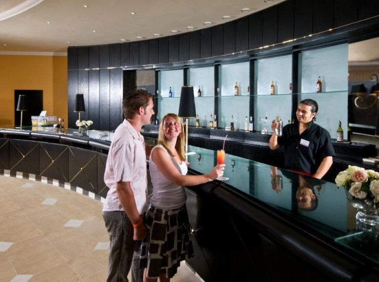 Alcoholic and non-alcoholic drinks are served at the bar of the nightclub.