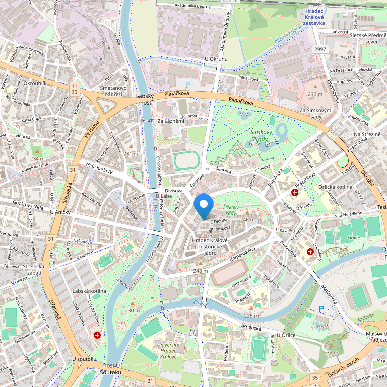 Отель расположен в тихом приятном месте, в историческом здании (бывший монастырь) на Большой площади в центре городе Градец Кралове. Реконструкция здания была с 1993 по 1997 год., оригинальные архитектурные элементы были дополнены современным дизайном. Недалеко от отеля находится известный театр Klicpera, бары, кафе, рестораны и танцевальные клубы. Город предлагает посетителям множество видов спорта, таких, как теннис и сквош - центр, аквапарк, поле для гольфа.