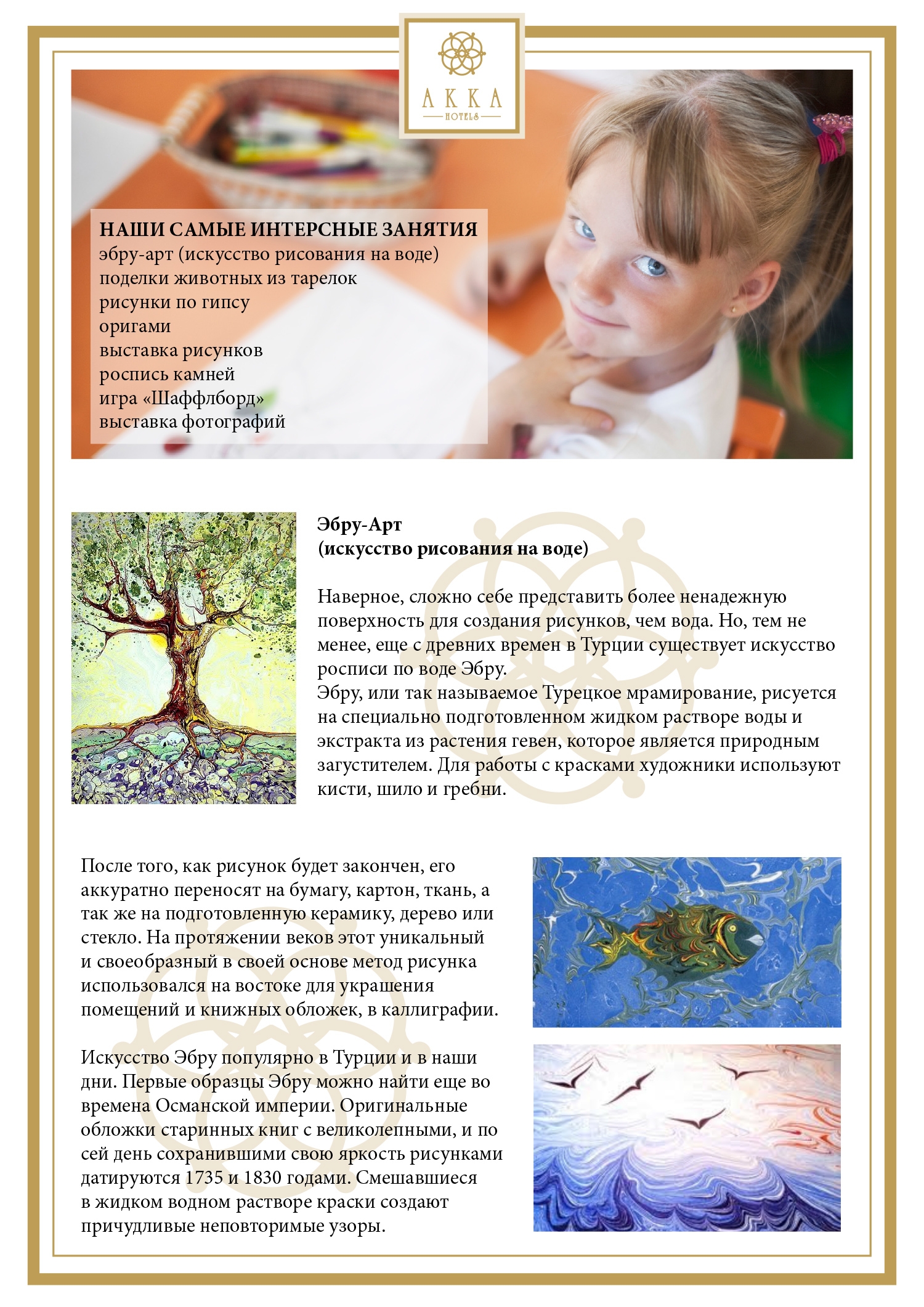 Самые занимательные мероприятия: Эбру-Арт (искусство рисования на воде), поделки животных из тарелок, рисунки на гипсе, оригами, выставка рисунков, роспись камней, игра Шаффлборд, выставка фотографий.