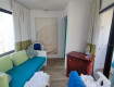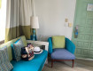 Смотрим номер - просторная прихожка с креслом, диваном и холодильником, два раздвижных стула, торшер, вентилятор, с одной стороны балкончик, с другой большое окно, номер с двумя...