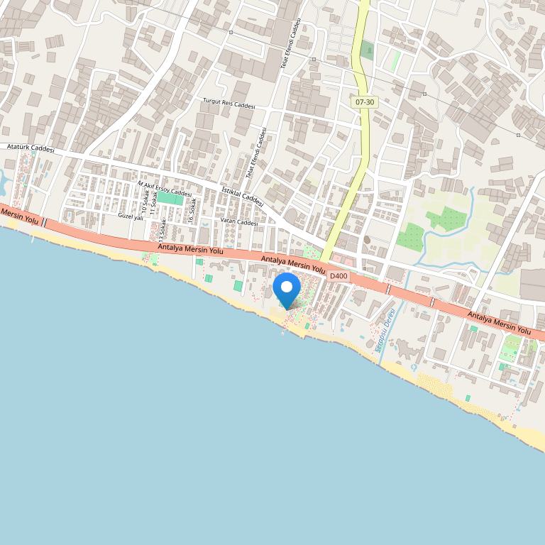 Отель расположен в 500 м от поселка Конаклы, в 15км от города Алания, в 110км от аэропорта Анталии.