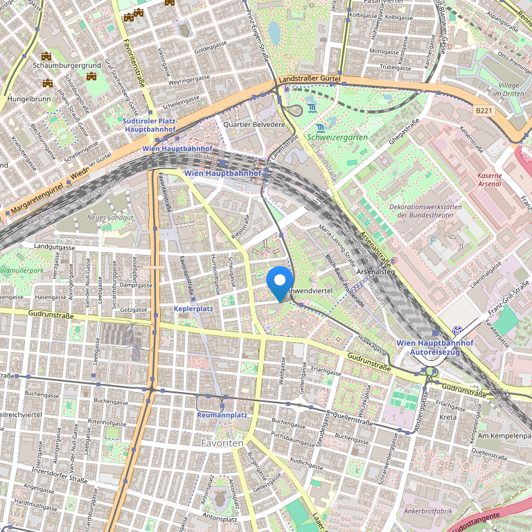Отель находится рядом с южным вокзалом в пяти минутах езды до центра города, рядом с известной пешеходной торговой улицей Фаворитенштрассе, удобен для отдыха и проведения конфренций.