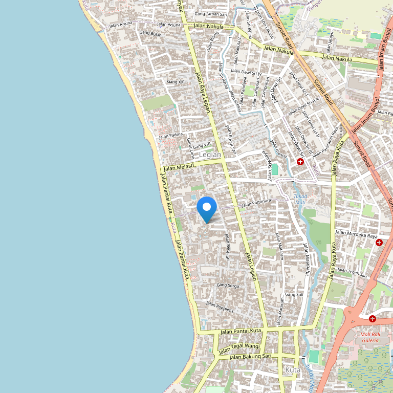 Отель расположен на юго-западном побережье острова Кута, в нескольких шагах находятся рестораны, бары и ночные клубы. Международный аэропорт Нгурай Рай расположен в 7 км от отеля.