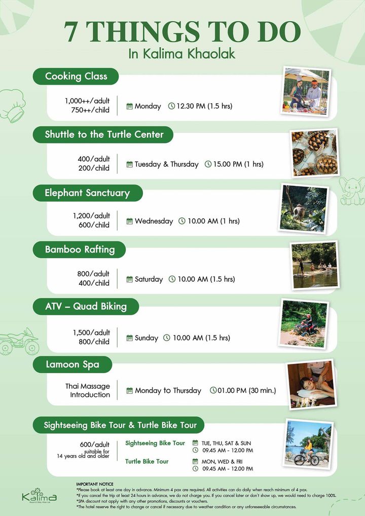 Здравствуйте, Елена! Благодарим Вас за обращение. Мы связались с представителями отеля по Вашему вопросу. Представитель отеля (служба Reservations отеля Kalima Resort and Villas Khao Lak 5*) ответил: "Пожалуйста, ознакомьтесь со стоимостью всех активностей".