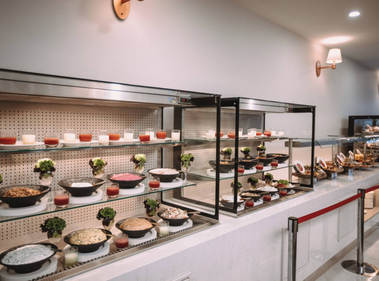 Ресторан приглашает вас в течение дня с 12:00 до 14:30. В ресторане подаётся богатое разнообразие блюд, салатов, фруктов, богатый выбор закусок, сладкой и соленой выпечки, пирожные, чтобы пообедать на пляже. Он также доступен с 16:00 до 17:00 с выбором свежей, разнообразной и специально приготовленной сладкой и соленой выпечки, пирогов и пирожных каждый день.
