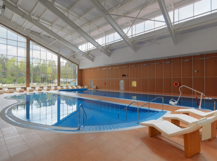 Крытый бассейн с подогреваемой водой (крытый, длина 25 м, ширина 5,8 м, глубина от 1,8 до 2,5 м, с 3 дорожками).
