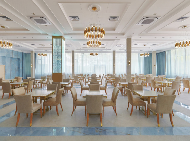 Ресторан вместимостью до 200 человек расположен в отдельном крыле корпуса. Панорамные окна с видом
