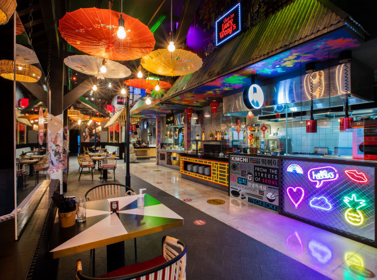 Шумная атмосфера, современный эклектичный декор и потрясающие виды на Бурдж-Халифа и городской пейзаж Дубая дополняются множеством смелых вкусов и специй, которые можно попробовать не только на динамичных кухнях Kim's Korean, Lucy Wong's, Momo San и Chatakana , но и из двух новых арабских и итальянских кухонь Ali's и Mario's. -