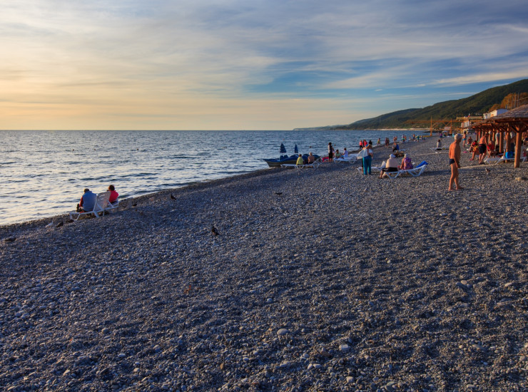Благоустроенный галечный пляж протяженностью 110 метров в 800 метрах от санатория.