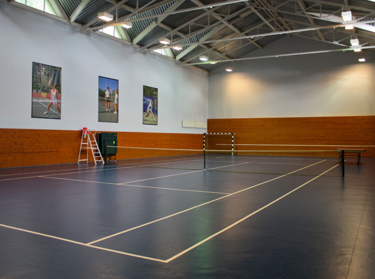 Теннисный корт с профессиональным покрытием "HARD", есть раздевалки, душ. Оборудован столами для игры в настольный теннис, перекатными баскетбольными кольцами, воротами для мини-футбола, судейским креслом.
