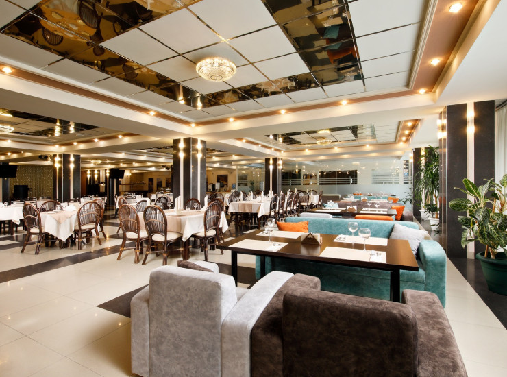 Для Гостей отеля круглосуточно работает ресторан (вместимость до 150 человек) с отличной кухней и уютной атмосферой. Мы рекомендуем обязательно его, чтобы насладиться гастрономическими шедеврами от наших поваров, выпить вкусный чай, ароматный кофе или разнообразные коктейлей, которые готовят настоящие профессионалы своего дела.