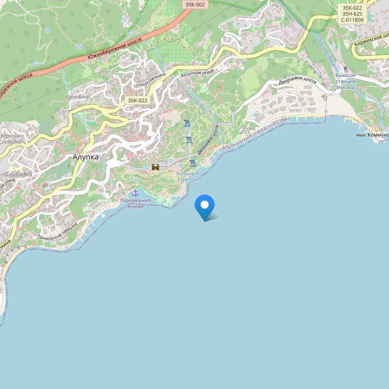 В 800 м от основного корпуса и в 10 метров от корпуса на пляже собственный, галечный, оборудованный (теневые навесы, лежаки). Проход на пляж от основного корпуса через Воронцовский парк по тенистой аллее.