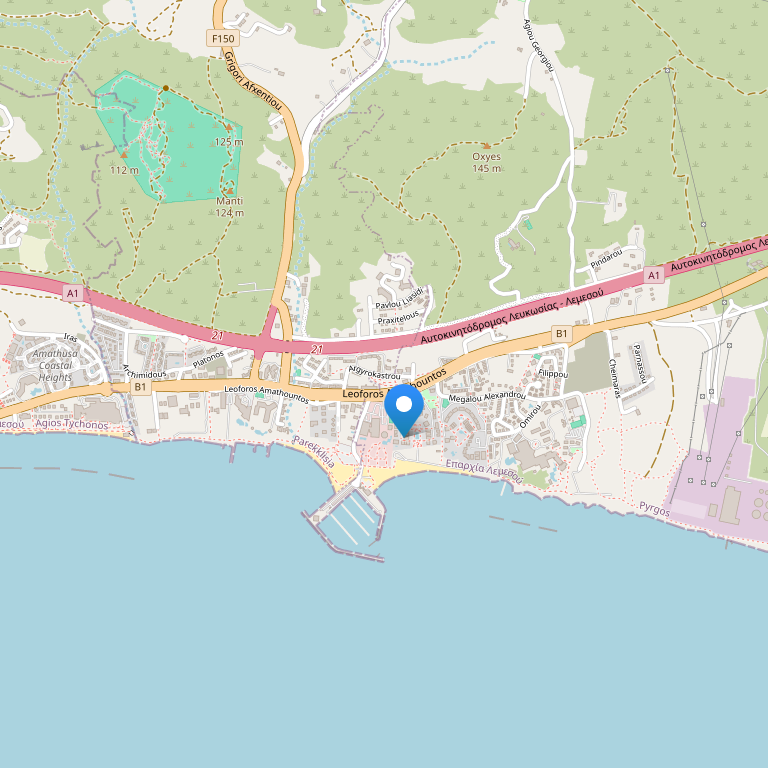 55 км от аэропорта г. Ларнака, 70 км от аэропорта г. Пафос, в 11 км от центра Лимасола. На первой береговой линии.