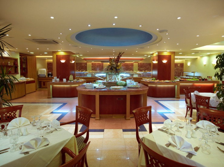 The Restaurant &#34;Vakhos&#34; is in the central building and allocates two verandas, one with view the river and one with a view the central swimming-pool. Its internal space in which you can find also a bar. The restaurant can host 200 individuals. The central restaurant fills all the conditions of hygiene and received signal of quality control, HACCP. Here the customer has the possibility of enjoying representative foods of Cretan Nutrition but also more generally Greek, Mediterranean and international food. The breakfast which is provided, is complete American type. In whoever from the two restaurant verandas selects, you can enjoy the dinner or your breakfast but also in internal restaurant. You will be satisfied by the big variety of dishes that exists, even for vegetarians or even children in the complete buffet that we offer.