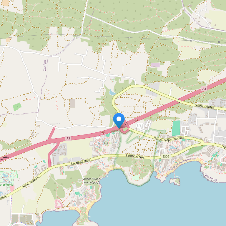 Отель расположен на берегу моря, напротив отеля Olympic Lagoon Agia Napa, в 3 км от Айа-Напы, в туристической зоне между пляжами Нисси Бич и Макронисис Бич, в нескольких минутах езды от аквапарка.