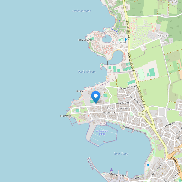 Расположен прямо на побережье, в 2 км от Умага, в Пунта – центре туристического курорта.