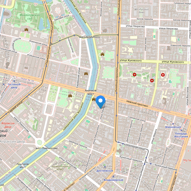 Отель расположен в центре города. В непосредственной близости находятся все основные достопримечательности города (Эрмитаж, Исаакиевский собор, Русский музей, Храм Спаса на крови, Михайловский замок, Адмиралтейство, Александро-Невская лавра), Московский вокзал и три станции метро: Маяковская, Владимирская, Достоевская. Международный аэропорт Пулково находится в получасе езды от отеля.