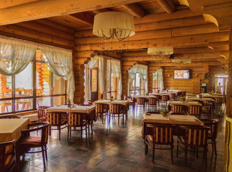 Ресторан Звенящий кедр построен из цельного кедрового бруса с большой летней террасой и рассчитан на 120 человек.