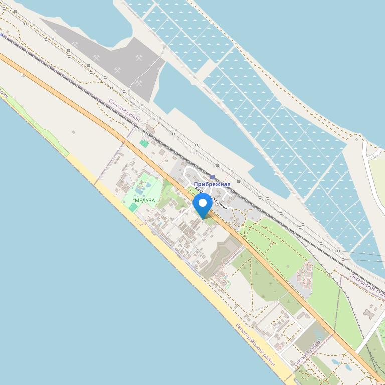Отель расположен на берегу Черного моря (первая береговая линия), в курортной зоне городов Саки и Евпатория, в 400 метрах от аквапарка.