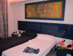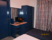 Жили в ярко-оранжево-красном номере (соседи, например, жили в ярко-синем). Номер обычный, две односпальные кровати, стульчик, столешница около окна (окно было мансардное, неудобно выступало в комнату, приходилось его обходить), телевизор. Верхнего освещения нет, только несколько бра...