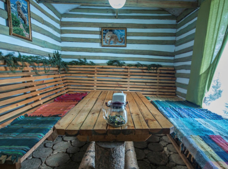 А вот просторный стеклянный зал ресторана представляет собой микс стиля шале и охотничьего домика: массивные балки, деревянная мебель, обшивка потолка обожженным деревом и огромные панорамные окна с красивейшими пейзажами, которые позволяют ощутить себя в настоящем царстве гор! Натуральное дерево, старинные казахские ковры ручной работы, меховые подстилки всё это делает пространство Сарай-Бара по-особенному теплым и душевным.