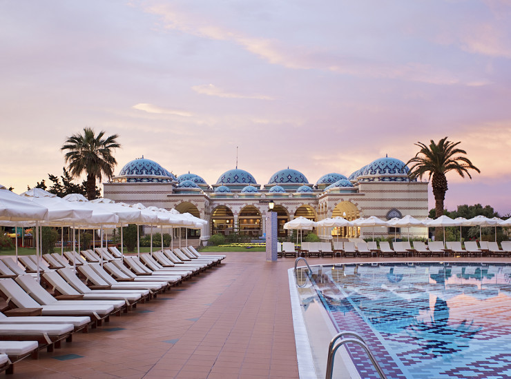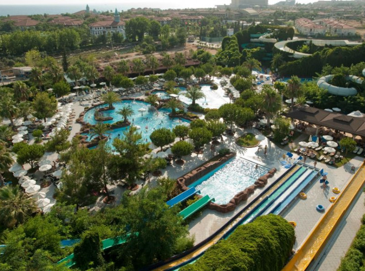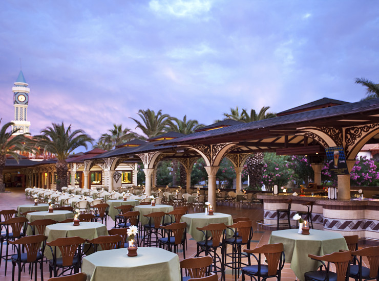 Прекрасная архитектура строений в истинно Османском стиле, живописный вид которому придают горы Торос, замечательное место для проведения шикарного отдыха. Отель расположен на огромной территории, площадью 380.000.м2. Сама територия отеля представляет собой настоящий парк, где можно прогуляться вечером и угоститься свежими фруктами, сорвав их прямо с дерева. Стойка Ресепшин находится в отдельном здании. К услугам гостей кондиционированные модернизированные главные рестораны, Набережный и ресторан а ля карт "Панорама". К другим услугам клуба также относятся: турецкое кафе (ТВ-зал); торговый центр в котором находятсямини-маркет, ювелирный магазин, сувенирный магазин и магазин кожи; 2 больших бассейна, один из бассейнов с подогревом (Март-Апрель-Октябрь), тихий бассейн; вокруг бассейнов бесплатные лежаки, зонты, пляжные полотенца, огромный Аквапарк, в котором имеется 25 водных горок, и пирс на пляже; Парк Приключений; мини гольф; Wellness&Spa центр и Балли домики на пляже, парикмахерская и салон красоты; разнообразно оформленные бары, расположенные в различных местах; услуги прачечной; 2 оснащенные сцены для вечерних шоу программ, открытая lounge дискотека, Органический сад,Ирландский бар(Март-Апрель-Октябрь). Шатры на пляже с индивидуальным обслуживанием. В дополнение к этим услугам, в отеле предоставляются услуги доктора и услуги профессиональной команды фотографов. Для любителей спорта в клубе имеется один из самых больших теннисных центров в мире, состоящий из 62 кортов, всемирно известная фитнес студия “Fitness First”, футбольное поле, зона со зрительной трибуной для волейбола и различные водные виды спорта (частная фирма). В клубе также огромное внимание уделено маленьким гостям, для них работают мини клубы, игровая площадка, плейстейшн, игровые автоматы, лунапарк, детские бассейны и игровая площадка с навесом на пляже. Отель также оборудован для людей с ограниченными возможностями.