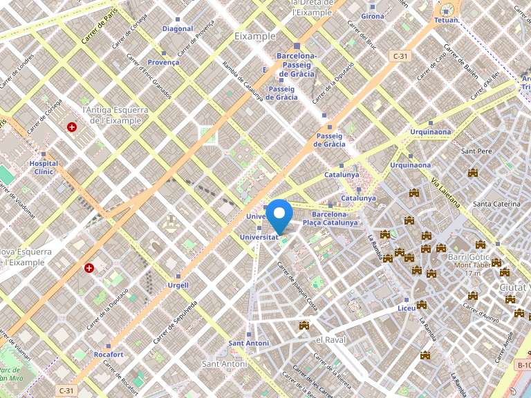 Отель располагается в здании с типичной модернистской архитектурой в центре Барселоны, в окружении бутиков и кафе элегантного бульвара Рамбла в Каталонии, в 25 минутах езды на такси от аэропорта El Prat Airport и в 5 минутах ходьбы от автобуса, идущего до аэропорта.