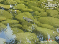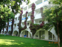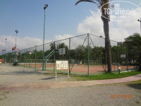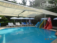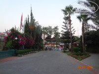 Территоря отеля большая и зеленая, очень ухоженная, шикарная. Много цветов. Всем найдется место в тени. Лежаки ставят прям на травке, они для этого немножечко другой формы, не такие как на песке на пляже. Травка не обычная, а специальная, похожая на клевер, ногам очень приятно по ней ходить босиком. Отель выстроен на территории бывшего ботанического сада. Фантазии для фотосессий предостаточно)))! Прям за нашим корпусом располагается небольшая птицеферма)). Живут два павлина, с полдюжины индюшек, петух, который кукарекает почему то не в 4-5 утра, а с 8 и до часу дня)). Деткам очень интересно! По территории свободно ходят 4 кошки, котята и ползает один толстенный кот. Рядом с рестораном имеется фонтан и прудик в котором живут две черепашки. Детей не оторвать было! На территории отеля есть 3 магазинчика, мне понравился тот, что рядом с дорогой, напротив ресепшена, через дорогу тоже есть. Если не планируете ни куда выезжать, то все можно купить там и необходимое вам и подарки и сувениры родным и близким. Принимают и евро и доллары и лиры. Есть теннисный корт. Есть два стола для настольного тенниса. Имеется детская площадка с тентом(см фото), детский стол(каш и супчиков нет!), детский бассейн (тоже с тентом). Достаточно урн и маленьких столиков для грязной посуды.