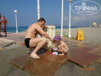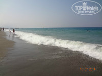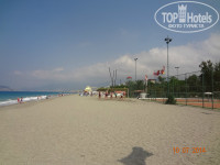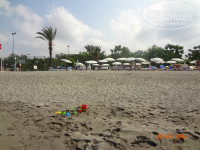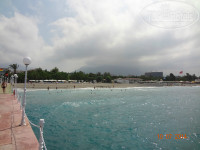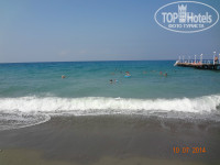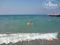 Теперь о главном, о море! Протяженность пляжа весьма приличная, метров 500. Крупный песок или мелкая галька(кому как нравится называть). Лежаков хоть отбавляй! Я советую купаться всем слева от пирса, во первых вода там теплющая, 28-29 градусов, никакого прохладного течения от речки я не обнаружила(зря переживала, начитавшись отзывов, но, наверное, в мае-июне другая история), во вторых рядом есть туалет, в третьих рядом бар-ресторан(в котором мы иногда обедали) и рядом релакс-бассейн. Справа от пирса глубоковато, там ни кто не купается, а ближе к речке тоже много народу их 1-го и 2-го окрпусов. Из моря мы просто не вылазили!(по правде я люблю воду от 31 градуса и выше). Первые 4 дня была средняя волна, было прикольно на них кататься. Дочке тоже нравилось, плавала с кругом. На 5-ый день почти полный штиль…и вот как раз на пятый день после обеда я почувствовала холодные струйки…Речка до обеда в море не впадает…только после 2-х дня. А на 6-7 дни был сильный шторм, я беременная конечно в море не лезла, ребенка тоже не пускали(барахтался в прибое), а вот муж плавал. Волны высотой 1,5-2 метра, поднимали со дна моря рыжий песок и с грохотом рушились о берег. На пляже не обнаружила ни одной ракушки, что меня чуть-чуть опечалило. Медуз не было. Заход в море нормальный для Турции…сначала средняя галька(1м), потом кусочек бетонной плиты(типа тех, что кладут на школьных дворах), достаточно по шире расставить ноги и вы ее благополучно минуете, а потом чудесный песочек. Вода по грудь метра 3-4, потом глубина. Температура воздуха 30-31 градус, зря пугали июльской жарой, а в те дни, что был шторм, вечером было ветренно. Влажность воздуха 80%. Не понимаю отдыхающих с волдырями от солнечных ожогов, как будто в первый раз! Любите себя и пользуйтесь солнцезащитными средствами и «Пантенолом» после пляжа и берегите детей, их нежную детскую кожицу! Лежаки с мягкими матрасами, которые хранятся отдельно.
