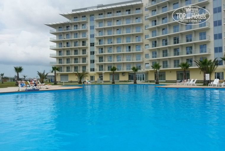 Территория чистая, благоустроенная, пальмы, газонная трава. Ввиду молодости отеля зелени, а именно деревьев не хватает. Бассейн находился рядом с корпусом, вода чистая, ну а сам бассейн не очень глубокий, отделка внутренней поверхности синий пластик в AZIMUT Hotel Sochi 4 плитка.