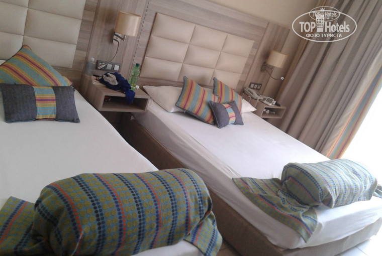 Итак, заселение и номер. Приехали мы в 5 утра, заселили в 13-30. Ничего не платили, но номер достался удивительный. Вид на бассейн и море. Единственный минус - расположение кондиционера!!! Из-за него заболела на отдыхе и провела денек с высокой температурой.