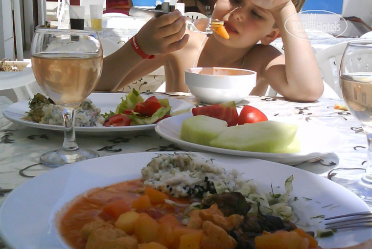Что касается еды-мы голодные не ходили и не похудели за время отдыха,на тройку сойдет.Очень понравился рис,баклажаны в разных видах и перец.Наелась до отвалу арбузов и дынь.В баре всегда наливали без проблем,что попросишь и сколько попросишь-да на жаре много и не выпьешь.Единственное пожелание-вино должно быть охлажденным.