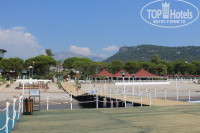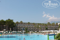 Что касается территории, она реально большая, не смотря на большое количество отдыхающих места хватит всем. Мраморные дорожки, дорожки со спец.покрытием, ,бассейны для детей и взрослых, релакс бассейн, бары, амфитеатр, огромный пляж, водные горки.