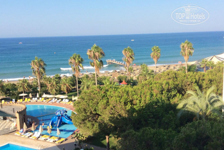 Добрый день! Много путешествуем, в Турции была в последний раз больше 10 лет назад... Отзывы противоречивые, по порядку о своем пребывании. Отель находится очень удобно и комфортно в сравнении со многими другими. Территория не маленькая, ухоженная, очень зеленая и грамотно продумана с точки зрения ландшафта и дизайна. Были заселены с ребенком в новый корпус отеля, что порадовало, после комментариев отдыхающих из старого корпуса. Коррупция процветает, поскольку за переселение по отзывам отдыхающих надо было доплатить на стойке регистрации. В нашем номере не было комаров, шикарный вид с балкона на море, чисто. На стене вздуты обои в одном месте, в ванной при отбитой кафельной плитке электроразетка болталась на проводах, о чем было сообщено сразу обслуживающему персоналу. Запись в журнал произведена, но ничего не изменилось. Необходимости настаивать у нас не было. Прекрасная береговая линия, песок, заход в море-галька. Пирс был закрыт-не отремонтированы деревянные ступени и само основание, прыгать запрещено. Лежаки, зонтики в большом количестве. Ввиду того, что большие волны за все время отпуска не давали возможности маленьким детям купаться в море, пляж полупустой. Большинство туристов предпочитает загорать у очень хлорированного бассейна... Вопросов к персоналу особых не было, мы сами очень чистоплотные, в номер заходили уборщицы ежедневно, поменяли нам полотенца и лишь банные, один раз за пять дней. Воду добавляли регулярно, но по приезду в холодильнике ни фанты, ни колы не было (меня это не огорчило). Персонал в ресторане-столовой приветливый, на регистрации и отеле уже заметно уставший и похоже озлобленный. Видела и штаны у кого то грязные, и рубашку рваную, мятую одежду в принципе у ребят - обычное дело. Весь отель забит, неплохо работает реклама, либо стоимость приемлема при указании такого количества звезд. Отдельная тема в отношении питания. Большой ассортимент салатов, мяса, есть рыба, мюсли разных видов, не молоко-нечто, овощи-стандарт. Но в ресторане-столовой постоянно в эту жару стоял кислый запах. К сожалению, приходилось быть в поиске приемлемой пищи и питья ( спрайт, кола, фанта и разведенные напитки для ребенка считаю не правильным выбором), соков не было, и даже платных свежевыжатых на территории отеля не нашли. Фрукты разбирались сразу, предпочтение отдавалось винограду, персикам, нектаринам. Если Вы пришли через полтора часа после начала ужина, то Вас могли ожидать лишь арбузы, дыни, сливы:) Утром можно было дождаться яичницы приготовленной при Вас, вечером - пиццы неплохой с разной начинкой, мясо, что жарили - было полуфабрикатом из заморозки, а значит оставалась курица, мясное с овощами брать остерегались:) Из выпивки была водка, джин, виски, вино белое, красное...все производство мне незнакомое, вино точно бодяга:), по мнению туристов более менее приемлемым-водка, джин. Поэтому бокал холодного пива вечером, лишь то, что можно было позволить без страха за свое самочувствие. Но одну ночь все же живот крутило:(, так что совет- берите активированный уголь, энтеросгель и смекту- лишним не будет! И голодными в любом случае не останетесь. Днем на территории, рядом с рестораном a-la-carte местные бабушки готовят турецкие блинчики и можно попробовать айран. Это действительно вкусно и приятно! Дети в очереди ежедневно стоят за мороженным 