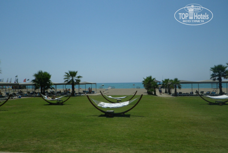При отеле огромная зеленая территория. Есть свое гольф-поле. По территории протекает река. Огромный пляж, поделенный условно на несколько зон. Есть "тихая" зона. Там все говорят шепотом и люди мирно дремлют на лежаках, есть активная зона, где играют в волейбол. Но везде все говорят тихо, дабы не мешать остальным. Это ОЧЕНЬ КОМФОРТНО и располагает к релаксации. Пляж песчаный, только небольшая полоса гальки у моря. Про бассейн ничего сказать не могу - мы там не бывали, только мимо шли. Выглядит хорошо )