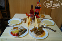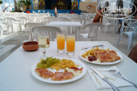 ЕДА хорошая,разнообразная,ЗАВТРАК колбаса,сыр,хлопья,яичница,иногда сосиски жареные-классные,творог, плюшки всякие разные,что странно омлет не утром дают а в обед или вечером и то не всегда,кофе,чай,какао,соки.ОБЕД и УЖИН и рыба и курица и индейка,салаты,подливки,суп пюре,вообщем голодными точно не останетесь,каждый для себя найдет что поесть,а также раз в неделю(у нас в воскресенье) был рыбный день-креветки это супер,оочень вкусные,не то что у нас..Из фруктов постоянно виноград и дыня,реже арбуз,яблоки,по утрам сливы,а так же нектарин и персики.Сладости тоже супер,разные и не заканчиваются)правда в очереди постоять придется).Вино красное,розовое и белое,нам больше розовое понравилось,красное тяжеловато как то,официант по желанию приносит,мы ему по динару в день оставляли-он нам столик резервировал)