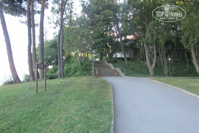 Отель находится на краю города Золотые пески, что делает возможным комфортно спокойно отдохнуть от суеты, погулять по берегу моря, посидеть на скамейке в прекрасном сосновом парке. В том случае, если хочется окунуться в атмосферу бурного праздника и мир ларьков и магазинов, достаточно пройти 300-350 метров и окажешься на набережной с барами, кафе, ресторанами и магазинами.