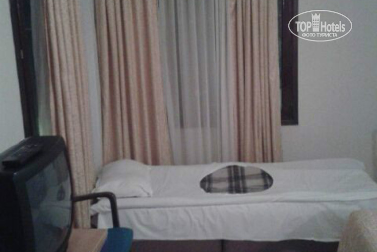 В номере моих родных не было душевой кабины, т.е. выглядело это так: стена, из нее торчит кран.. И когда вы решили воспользоваться душем, то что происходит?.. Да, вода брызгает во все стороны.. Приятно? Неочень.. Но тут что могу сказать, слава Богу, что вообще есть, где помыться.. Дальше пройдемся по номеру. Грязные шторы, постельные покрывала чем-то испачканы, нет вешалок и сушки.. Лето, море, где сушить полотенца пляжные и купальные костюмы? Спрашивается.. А однажды пошел дождь. Так что вы думаете? В номере под окнами начало так неслабо протекать (фото прилагаю). Так, что еще.. Но подождите, это же как никак отель 3*..