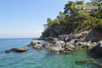 Я дважды отдыхала в этом отеле, и с уверенностью могу сказать, что пляж у него самый лучший в Гюзельчамлы,т.к. там нет проезжей части, он последний в посёлке и места на нем предостаточно. В воду можно спокойно зайти и без пирса. В 2013 году действительно были камни ( около 2м от края пляжа), но в этом году уже был расчищен проход без единого камня, только мелкий серебристый песочек Эгейского моря. Водоросли бывают у берега после шторма, но они похожи на сухую солому, и не доставляют никакого неудобства. Бич-бой их периодически убирает.