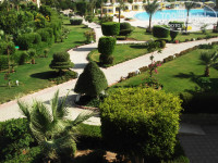 Территория отеля ухоженная и зеленая, цветочки, пальмочки, стриженние кустики, дорожки и очень большая.