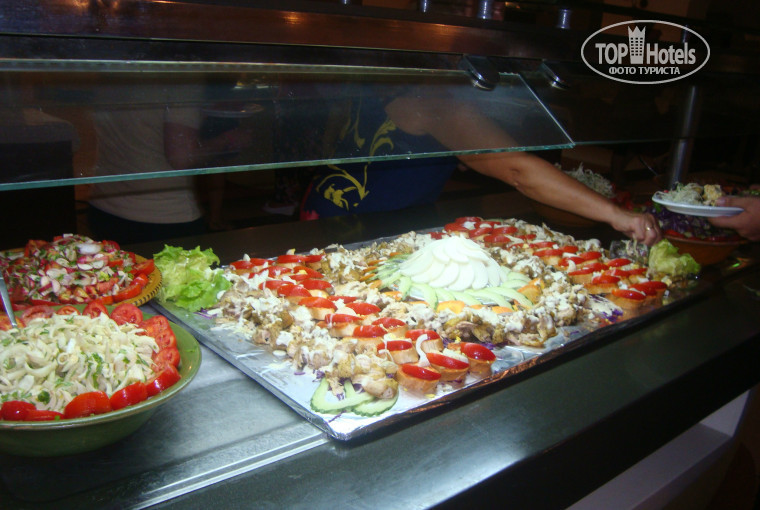 -потом сразу после водной аэробики мы шли на обед. на обед был большой выбор еды (покрайней мере я всенгда могла выбрать что хочу). Например, были: макароны, картошка, рис,кус-кус, говядина, курица, яицница, индюшатина, тушенные овощи, молочная подливка, разные салаты: огурец с помидором, просто помидор, просто огурцы, салат из свежей капусты, из редиски, суп и т.д.. Там же был сладкий стол, вот на нем было разнообразие, а вот с фруктами было туговато, были только либо дыня либо виноград. Официанты работали оперативно, сразу же убирали и если вдруг тебе что-нибудь понадобится и тебе лень подниматься, то можно попрасить и они тебе с улыбкой принесут.Также вначале обеда всегда выходили повара в зал.