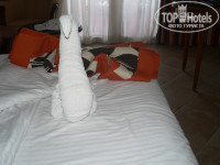 Номера убирают средне. Постель поменяли на пятый день.Спрашивали у других, такая же история. И то, когда простыни и пододеяльники свернули в кучу. Их и поменяли, наволочки поменяли потом. Но мы на это особо не реагировали. Лебедя скрутил один раз и один раз рыбку, за что и получил награду. А еще приятно удивил, когда по приезду мы не успели отмыть свои мазилки для загара (что-то протекло, и они все были в масле), пришли после моря на второй день, а они все перемыты и чудесно выставлены по порядку. С удовольствием отблагодарили. Ванну за всё время не мыли ни разу. А ещё просто выводила из себя система подачи горячей воды. Сначала включаем воду, она идет в нижнем кране. Затем дергаем рычажок-переключатель. Так как душевая лейка вделана намертво в стенку, то вас окатывает водой и не всегда приятной температуры. Затем нужно успеть быстро и намочить тело, и намылиться и всё смыть. Вода отключается в самый неподходящей момент. И всё снова нужно повторить. За время купания такой фокус приходится повторять неоднократно. Вода жесткая, промыть волосы очень тяжело. В номерах кладут маленький кусочек мыла, 2 шампуньчика и 2 гельчика. Пришлось купить кондиционер для волос, иначе на голове была солома. В отеле довольно хорошая аптека, там и купили. Есть и еще несколько магазинчиков, но мы все покупки сделали в аэропорту в Хургаде на обратной дороге. На второй день вода так и не уходила в раковине, а еще и телевизор перестал показывать. Снова сделали заявку на ресепшене. Все мило улыбались, и записывали. Когда и на третий день, придя с пляжа мы убедились, что никто ничего не сделал, нас "прорвало". Девушка снова мило хотела записать нас в свой список, но слово "претензия" взымело действие. Тут же в два телефона она стала быстро говорить, но слово инженер мы поняли. Пока мы шли к своему номеру, видно инженер добежал быстрее. Муж был в шоке, когда увидел, что этот "инженер" отверткой приличных размеров что-то шуровал в сливном отверстии. Муж предложил разобрать снизу сифон,тот замотал головой и пообещал, что все будет работать. И ведь работало!!! Да и телевизор уже показывал. Мы подумали, что у него не отвертка, а просто ноу-хау для наших "инженеров". Во всем остальном никаких других претензий к отелю нет. Территория зеленая, чистая. Вечером поливают газончики. Много цветов, а еще на газонах растут шампиньоны. Не ожидали такое.Как дождь три дня. Особенно в середине - просто ливень. Потом все лежаки были мокрые. Хорошо, что уже уезжали на следующий день, и под дождик.