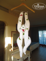 Дождавшись 14.00 нам дали номер, мы очень удивились, что с видом на море, хотя оплачен был garden view- с видом на сад. Видимо работники ресепшна оценили наши мучения ))) К номеру претензий нет- все отлично! Из русских каналов только ОРТ и РТР. Остальное итальянское, арабское, немецкое и т.д. Есть пустой холодильник, была только вода 1 литр в день, пара пакетиков кофе, чая и сахара, был чайник электрический, фен , ищите его в ящике под зеркалом, в ванной его не найдете, перенести его нельзя, так как он там встроен через тумбочку в стену, чтобы не воровали наверное)))) Есть в номере гладильная доска со встроенным в нее утюгом.)))))) Мы оставляли в номере чаевые для уборщика - нам делали из полотенец разных причудливых лебедей и обезьянку напоследок.