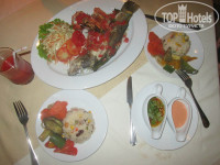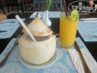 Обедали и ужинали в кафе отеля на пляже. Здесь вкусно, мы перепробовали почти все меню. Цены завышены, пиво- 120 бат,коктейли алкогольные-250, коктейли из фруктов- 150, кокос-100, спагетти любые- 280, пицца- 250, тайский рис в ананасе-180(очень красиво , много и вкусно),блюда с рыбой, курицей и мясом от 400 и выше, но готовят вкусно. В рыбные вечера выставляют лодку с морепродуктами, украшенную пальмовыми листьями, овощами. Выбираешь , цена указана за 100 грамм и при тебе готовят- тоже очень вкусно.
