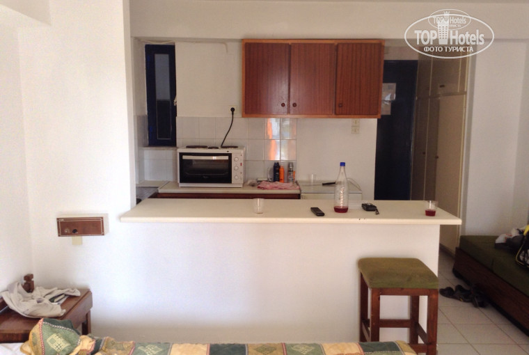 Буду первым. Выбирал отель не по отзывам (их не было), а по расположению (уже был в Херсониссосе, смотри мой отзыв о Flisvos Beach отель). Отель расположен на улочке перпендикулярной пляжной линии - значит тихо. До моря метров 50-100, до магазина Spar метров 300. В номере есть кондиционер, холодильник, электро плитка с духовкой (2 в 1), телевизор без русских каналов, WI-FI в зоне ресепшен., набор посуды. Балкон большой. Сан узел нормальный. Душ, как и везде, поддон со шторкой. Все работало, уборка была ежедневной. Обратите внимание, что у отеля несколько корпусов. Из некоторых вид на единственную улицу, по которой все ездят, т.е. может быть шумно. Номеров с прямым видом на море всего несколько, они над макдональдсом. Причем со второго этажа вида нет, только с третьего !!! Учтите, что за вид придется расплачиваться шумом от дискотеки, которая прямо напротив !!! Прокомментирую описание отеля на этом сайте.