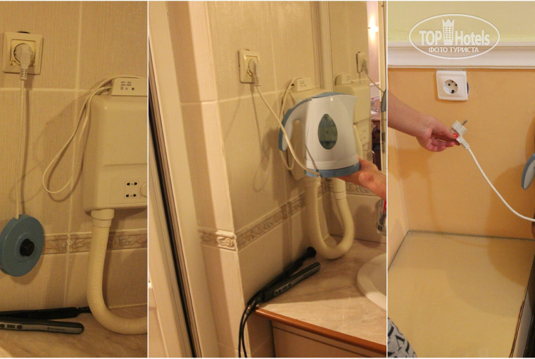 Розетки, вообще отдельная тема: есть чайник, чашки,решили попить чай НО, до розетки шнур не достаёт, + сами розетки изначально были круглые, а потом их видимо сменили квадратные, на фото очень хорошо видно, как квадрат не закрывает дыру, сама розетка очень опасна, т.к вытаскивая вилку, розетка выходит вся с проводами, надо придерживать обязательно)